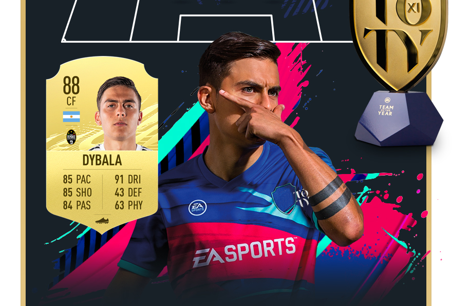 Paulo Dybala, el 10 de la Juventus pidió los votos de sus fans a través de sus redes sociales de Instagram y Tik Tok para entrar en el equipo soñado de TOTY, el Team of the Year de FIFA20. Una colaboración con el artista gráfico Félix Gil, para crear una experiencia única en las redes sociales, en una publicación con contenido reactivo mezclando la creatividad y el data de los skills del jugador.