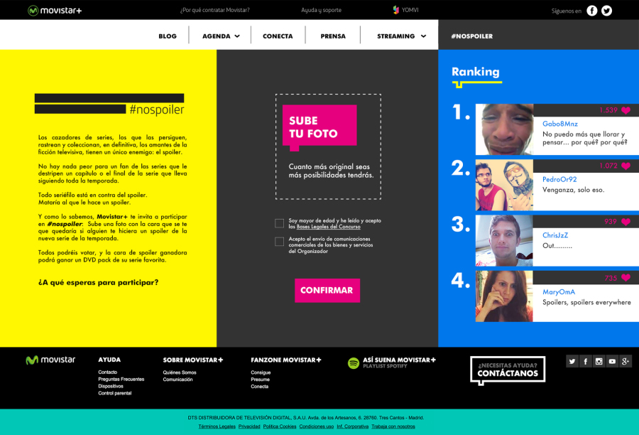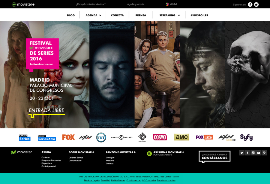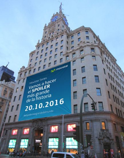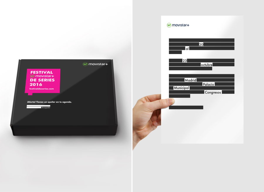 Propuesta creativa para el festival de series de movistar. La propuesta comenzaba con una acción teaser en el mayor foro del país: la Gran Vía de Madrid. Cubriríamos con una lona la fachada del edificio de Telefónica anunciando el mayor Spoiler de la historia. Sobre todo por su tamaño, porque el día de la resolución proyectaríamos en el edificio un trailer con las series que el público iba a descubrir en el festival.