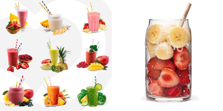 Otro gran cambio visual. Dejamos atrás los bodegones de frutas con vaso para crear un código propio de Zumit, metiendo la fruta cortada dentro del vaso. Además, creamos una vajilla para la marca: nuestro vaso-lata triunfa donde va.